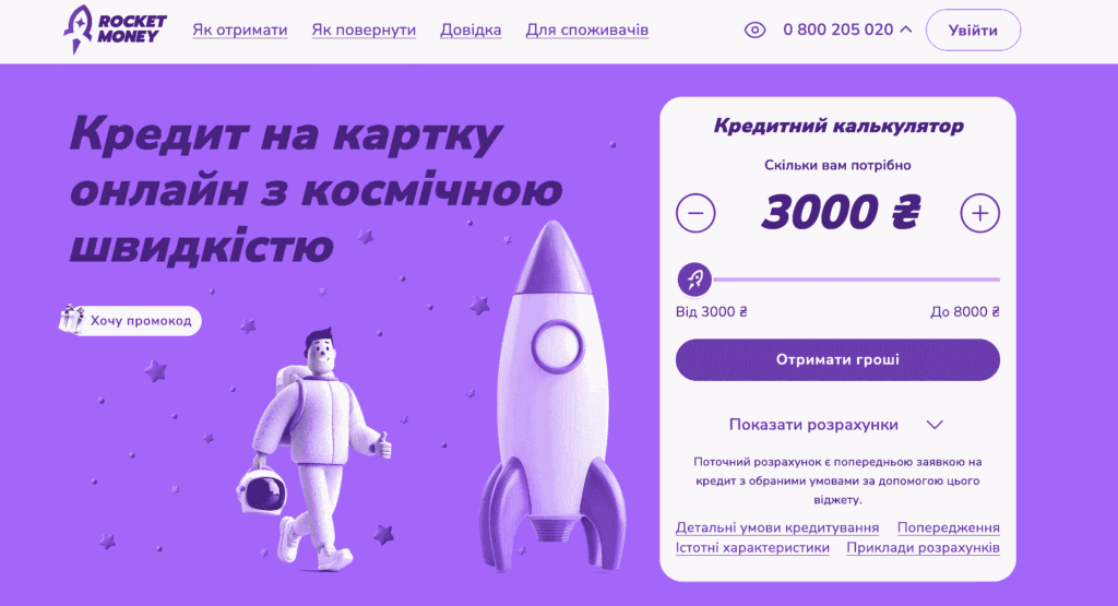 Максимальний кредит від Рокет Мані становить 8000 грн.